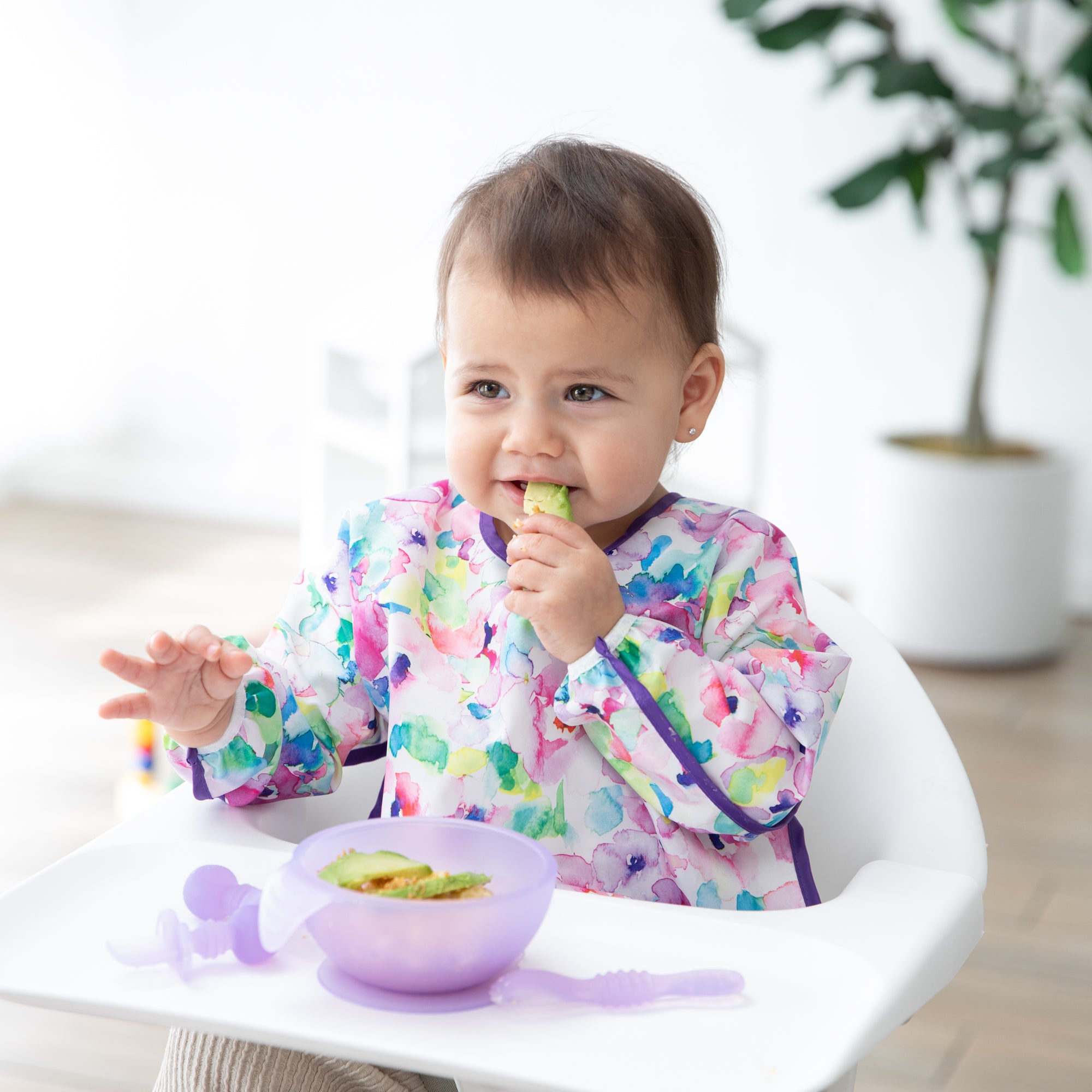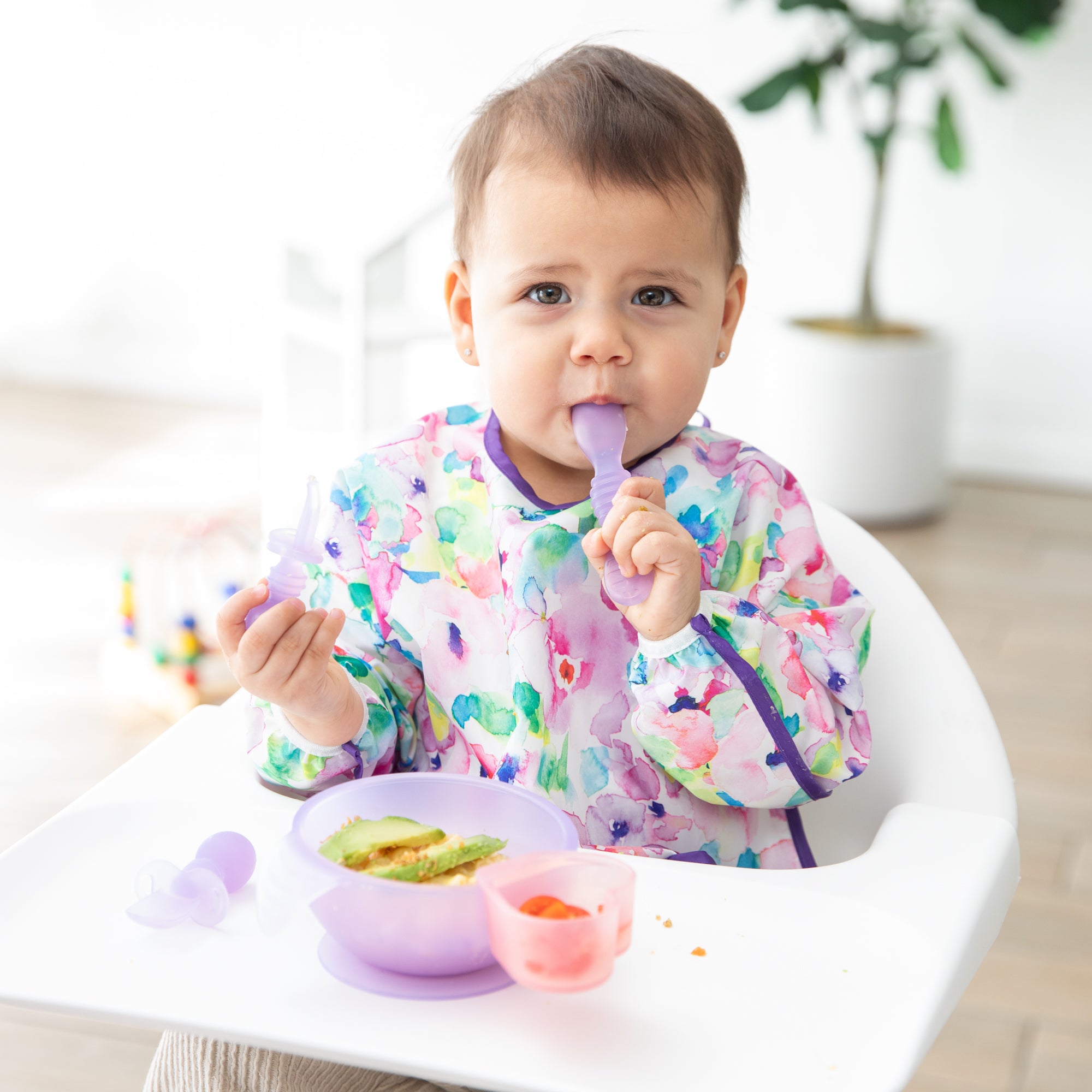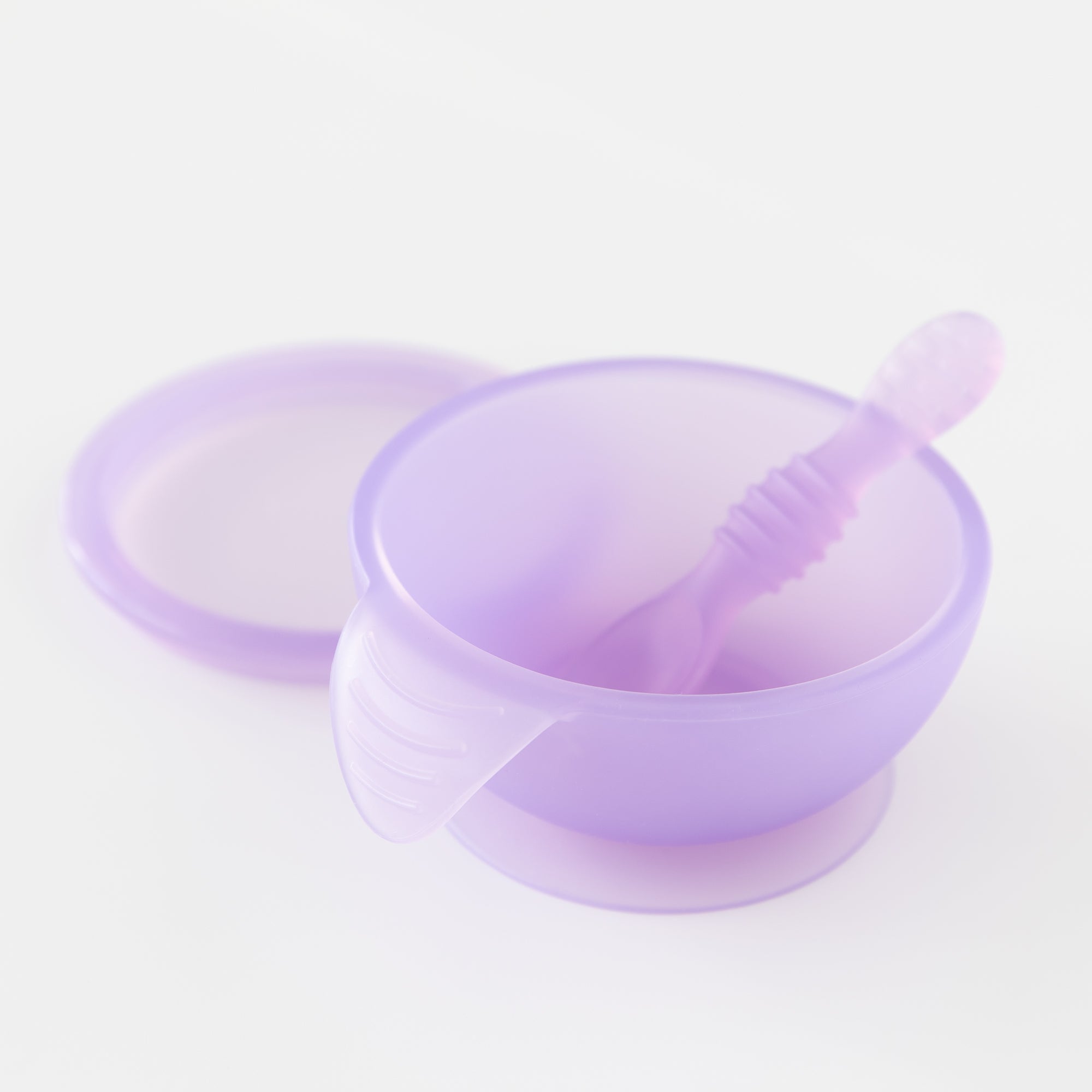 In full transparency, you're going to love this Purple Jelly Silicone First Feeding Set. It's your perfect companion to introduce solid foods and transition your baby to self-feeding. The suction base keeps the bowl from sliding or flipping over. Great for use on highchair trays or tables. The easy to grip double-end silicone spoon grows with baby – one end is for dipping into purees and the other for scooping solid foods. The bowl is designed with a curved handle so mom or dad can hold and help with feeding, and the spoon is soft and safe for teething babies. The set includes a clear silicone lid with a secure fit. Ideal for saving leftovers – the clear lid allows you to easily see stored food.