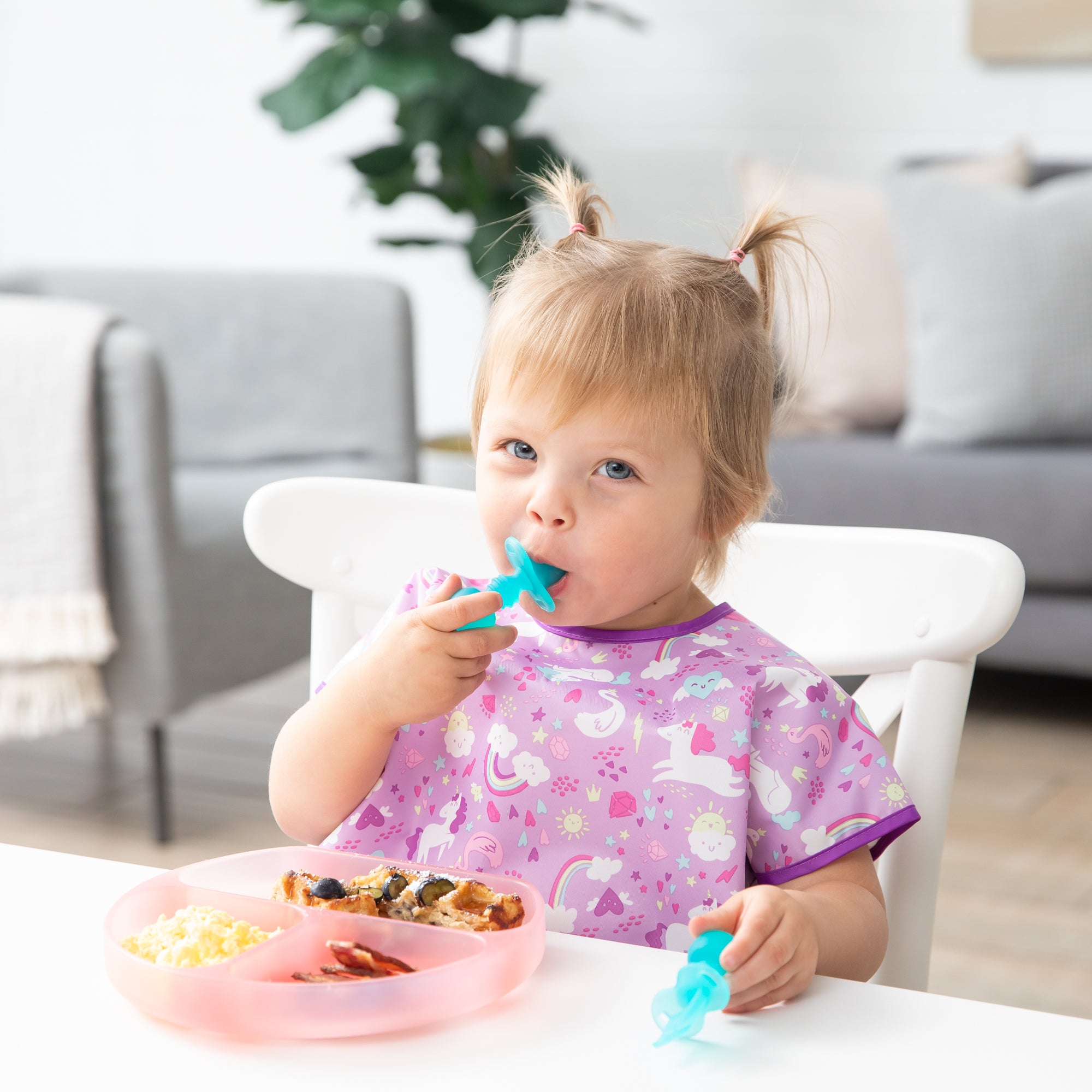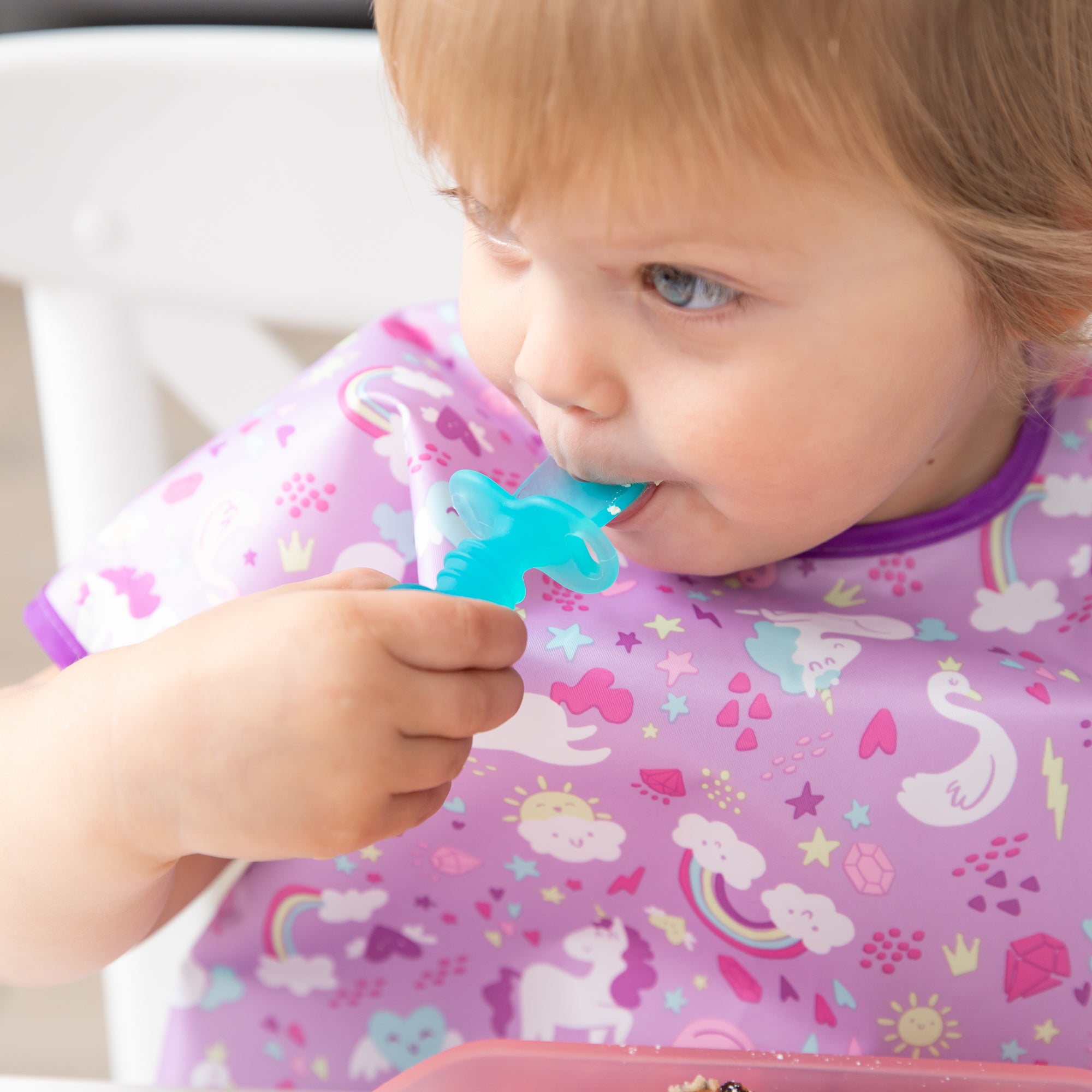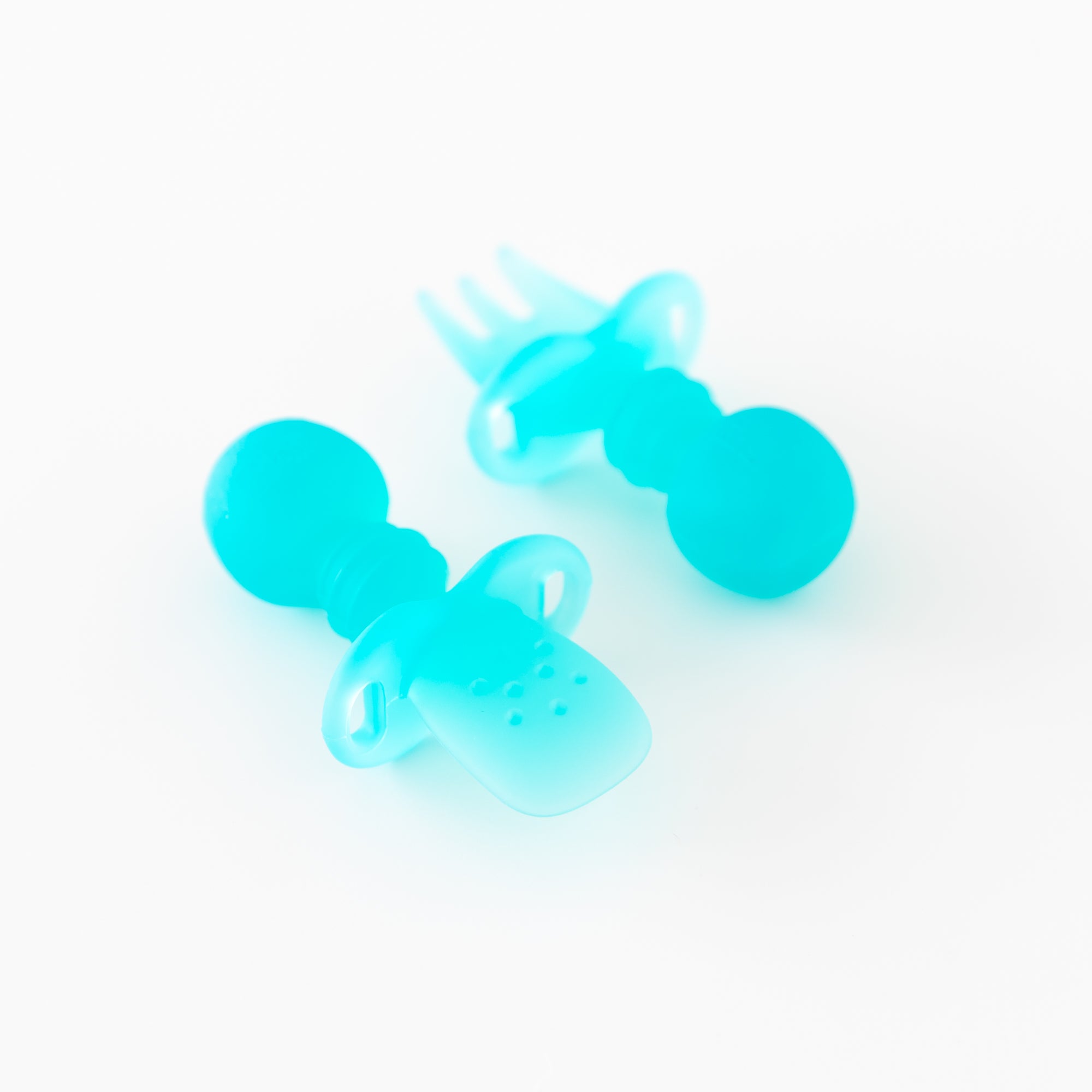 Bumkins Jelly Silicone Chewtensils are a see-through sensation! Designed for Stage 1 of baby-led weaning – introducing babies to the concept of holding a utensil and feeding themselves. Both the spoon and fork are made from soft, textured, 100% food-safe platinum silicone that’s easy to grip and gentle on tender gums, with bendable heads for safety. The back of the spoon head has sensory bumps to stimulate gums. They’re perfect for dipping into puréed foods at the early part of baby-led weaning. Our teething utensils are safe and can even be chewed on by younger babies before they’re ready to transition to silverware.
