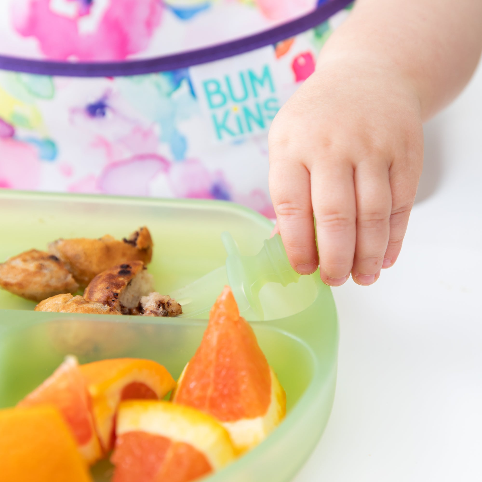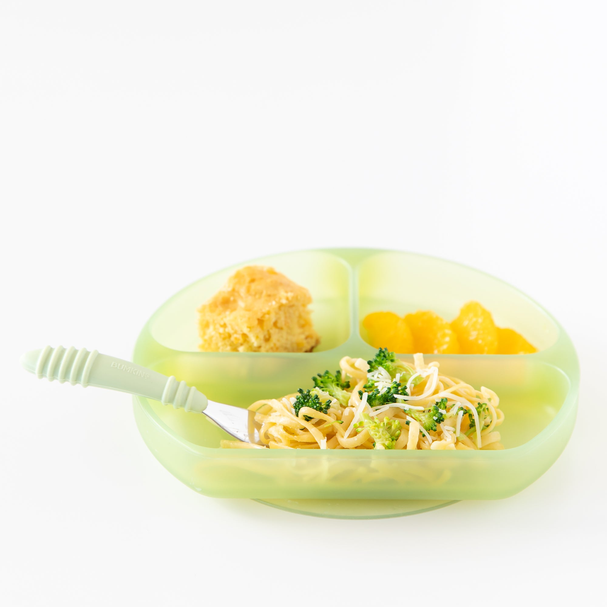 Move over jelly beans, there's a new Jelly in town! Bumkins Green Jelly Silicone Grip Dish is perfect for little ones learning to self-feed. The divided plate is sized right for baby and toddler portions and it fits and sticks to most highchair trays and tables. A strong suction base ensures the dish stays put – even with the most aggressive toddler! A straight side allows kids to belly up to the plate, allowing less of a mess. Silicone can withstand low and high temperatures, easily transitioning from the refrigerator or freezer to the oven or microwave. Made with 100% food-safe, premium LFGB silicone that’s durable, stain and bacteria-resistant.