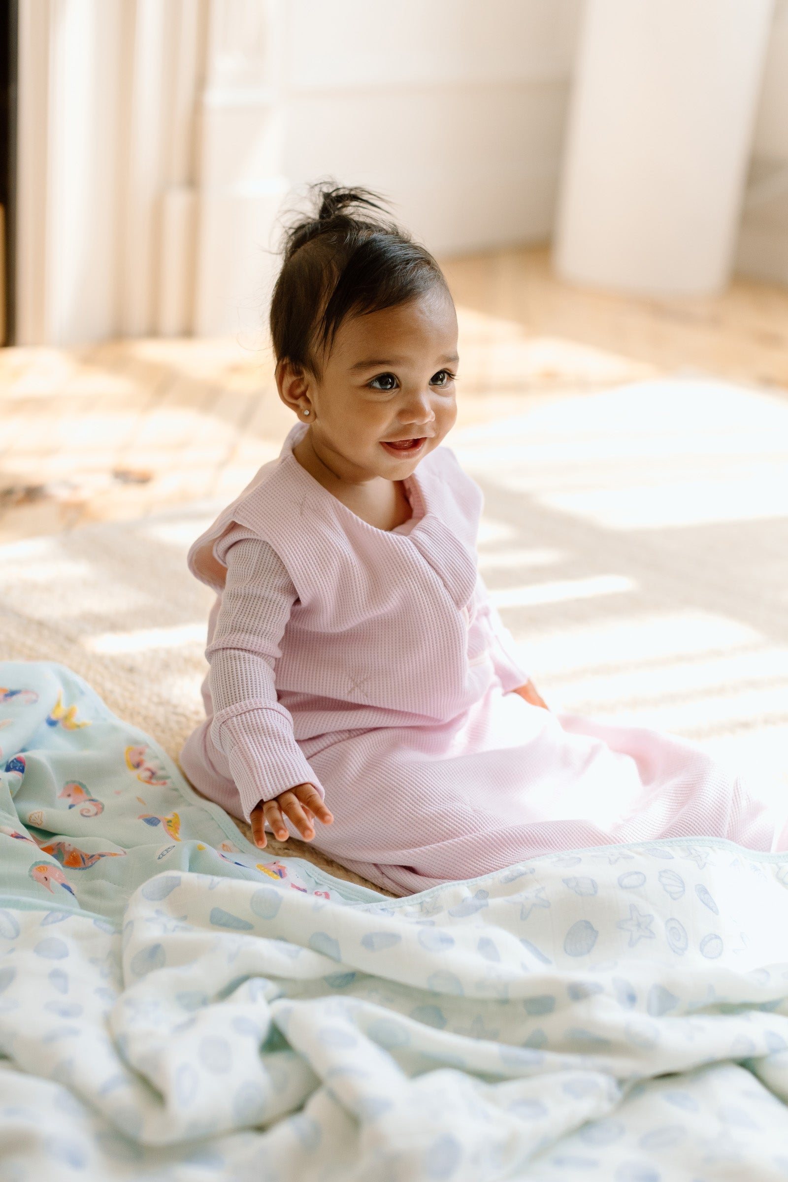 Made from our signature blend of ultra-soft and sustainable fabric using TENCEL™ Lyocell and organic cotton, our handy 1.0 tog waffle knit sleep sack keeps the baby safe and warm all night. Designed specifically for bedtime and naptime, this cozy and clever solution can’t be kicked off—which means a more restful sleep for the baby and the parents! It features a 2-way zipper that opens around the bottom for easy diaper changing and a sleeveless design that allows babies to move their arms freely. Insulated with Dupont Sorona, it keeps your baby cozy and comfortable. Manufactured at an OEKO-TEX Standard 100 certified factory, you can feel confident that our sleep bags are free of toxic chemicals and always safe for your baby.